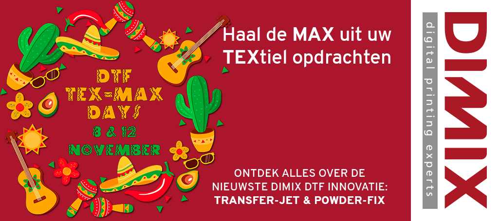 Haal de MAX uit uw TEXtiel opdrachten Hoog kwalitatieve textieltransfers produceren gaat dankzij de Dimix Transfer-Jet & Powder-Fix combinatie makkelijker dan ooit. Tijdens de TEX MAX Days zijn er live demo’s, DTF productpresentaties en leert u alles over deze nieuwe innovatie! U bent de .