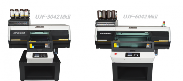 Mimaki UJF-3042MkII en UJF-6042MkII Mimaki introduceert de UJF-3042MkII en de UJF-6042MkII desktop flatbed printers. Deze toestellen gelden als opvolger voor de modellen UJF3042HG & UJF6042. Ze kunnen objecten bedrukken tot 153 mm dikte. De UJF-3042MkII met een maximum formaat van 30 bij 42 cm; .